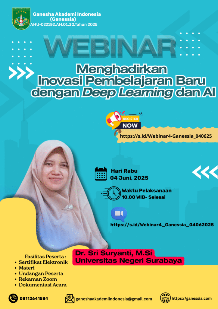 Webinar “Menghadirkan Inovasi Pembelajaran Baru dengan Deep Learning dan AI” yang diselenggarakan oleh Ganesha Akademi Indonesia (Ganessia) pada tanggal 4 Juni 2025 menghadirkan Dr. Sri Suryanti, M.Si dari Universitas Negeri Surabaya sebagai narasumber. Acara ini bertujuan untuk mengenalkan konsep dan penerapan teknologi Deep Learning dan AI dalam dunia pendidikan. Narasumber memaparkan bahwa Deep Learning merupakan cabang Machine Learning yang dapat meniru pola pikir manusia dan memberikan solusi inovatif untuk permasalahan pembelajaran. Sementara itu, AI atau kecerdasan buatan mampu mendukung personalisasi pembelajaran dan pengambilan keputusan secara otomatis.